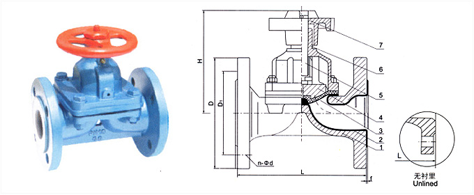 1.閥體 2.閥體襯里 3.隔膜 4.閥瓣 5.閥桿 6.閥蓋 7.手輪
