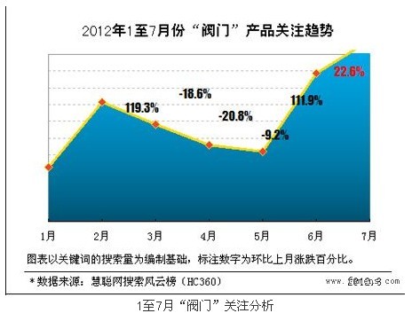 通過圖表,我們可以看出,對于閥門的需求,出現三個增長點,分別是2月份、6月份及7月份,近期觀察,6月份搜索關注增長比例最高,達到111.9%,究其原因,我們通過調查分析,歸結為建筑維修、裝修等項目對于閥門需求增大。6月份是各大小區進行加固及增加保溫層的季節,也是家居裝修旺季,除此之外,各大工程項目開閘,這些都加大了對于閥門的強勁需求。